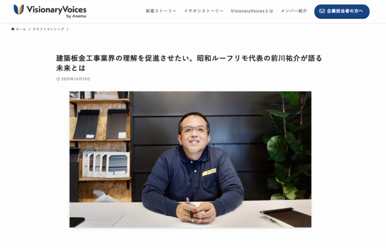 この度、インタビューサイト「VisionaryVoices」にて、テイガク(昭和ルーフリモ株式会社)代表の前川がインタビューを受けましたのでお知らせいたします。