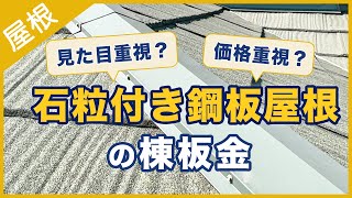 今回は、埼玉県狭山市の現場から「石粒付き鋼板屋根の棟板金」について解説いたします。今回お話しするテーマは、石粒付き鋼板屋根についてです。石粒付き鋼板屋根は、輸入品になります。そのため、国産のスーパーガルテクトや横暖ルーフといった商品と比べて価格が安いです。