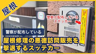 東京都練馬区のお客様宅で、屋根修理の悪徳訪問販売を防ぐために警察が無料配布しているステッカーを紹介した動画です。近年、悪質な屋根修理の訪問販売が増加しており、警視庁も注意喚起を行っています。実際にお客様は「飛び込み営業お断り」のステッカーを貼り、対策をしていました。
