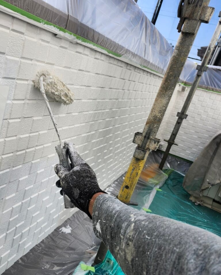高圧洗浄の後は、下塗りをします。既存のサイディングと塗料の密着を高める作業です。下塗り中塗り上塗りの計3回塗りです。