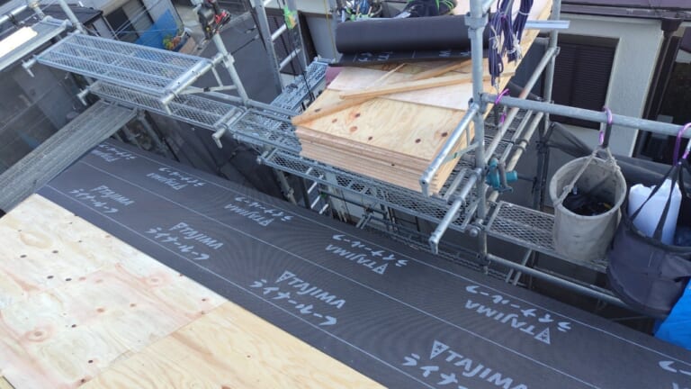 アスファルトが原料のシート状の屋根材。価格が安いが耐久性は低い。 |