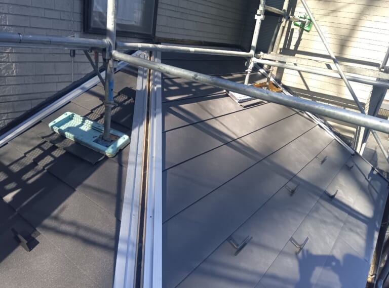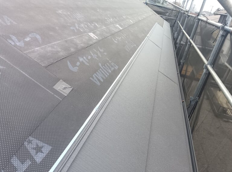 新規で使用する屋根材はアイジー工業のスーパーガルテクトです。スーパーガルテクトは断熱材一体型の屋根材で役物(ケラバ板金等)の止水性能にも優れています。