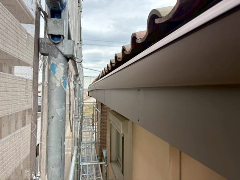 雨樋を取り付けて完成です。今回使用した雨樋は、PanasonicのNF-1型ファインスケアです。通常PanasonicPC50でのご提案になりますが、追加費用を頂くことでワンランク上の雨樋での施工が可能です。